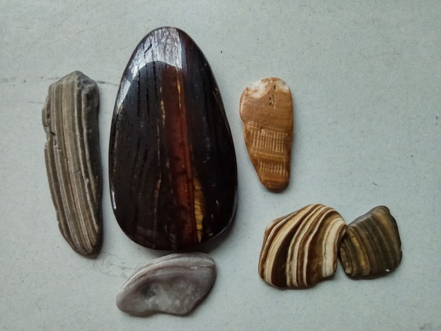 I sat in the sand briefly and found a fragment of a shell that reminded me of the stone the jewelry-maker had given me. I pulled the stone out of my pocket and laid it next to the shell. They were like a pair of mismatched striped wings. I decided the shell was to come home with me so I it went into my pocket beside the stone.